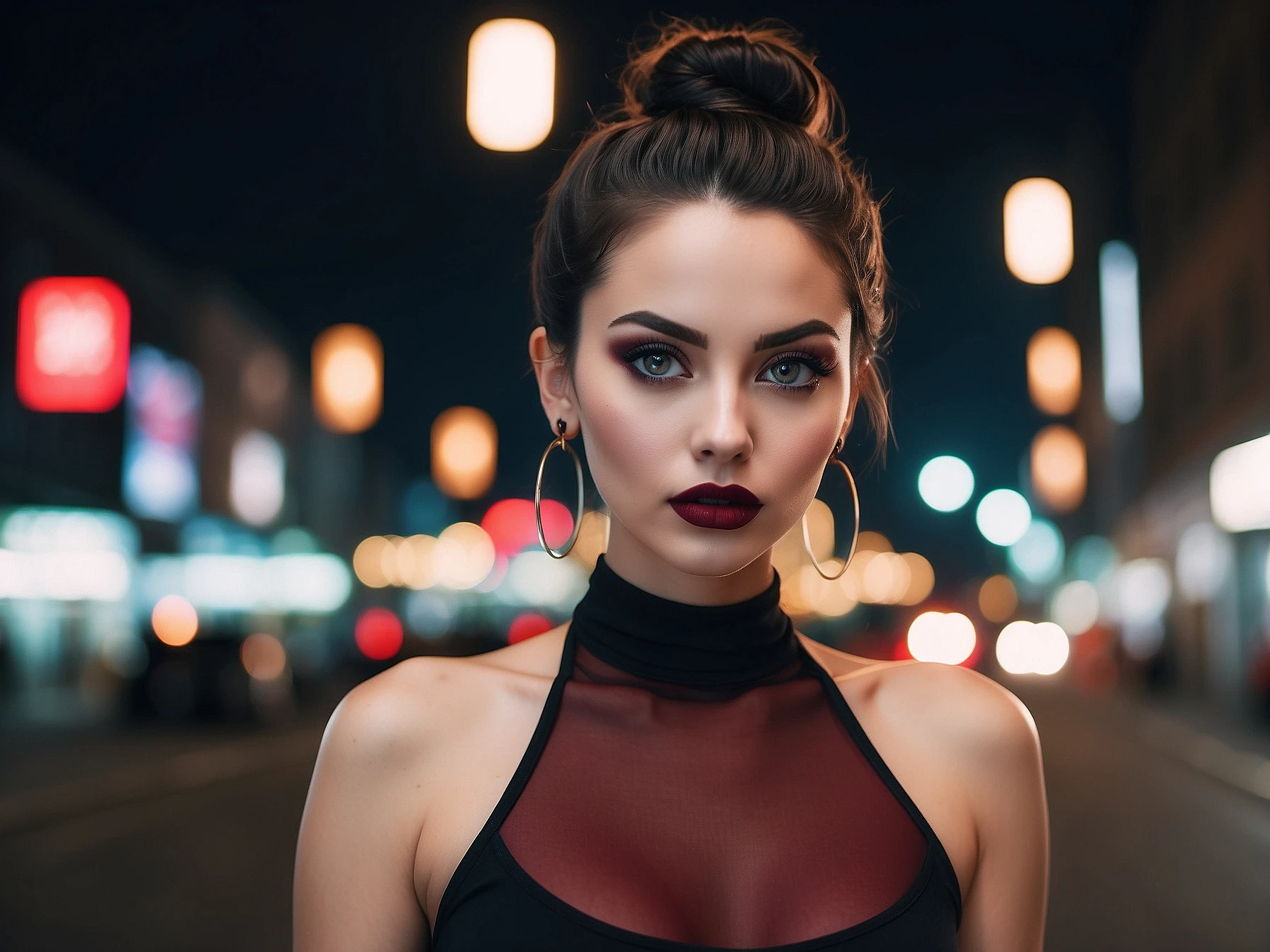 a woman in a black top with red lipstick, a photorealistic painting by Anna Katharina Block, featured on cg society, art photography, black background, bokeh, nightscape