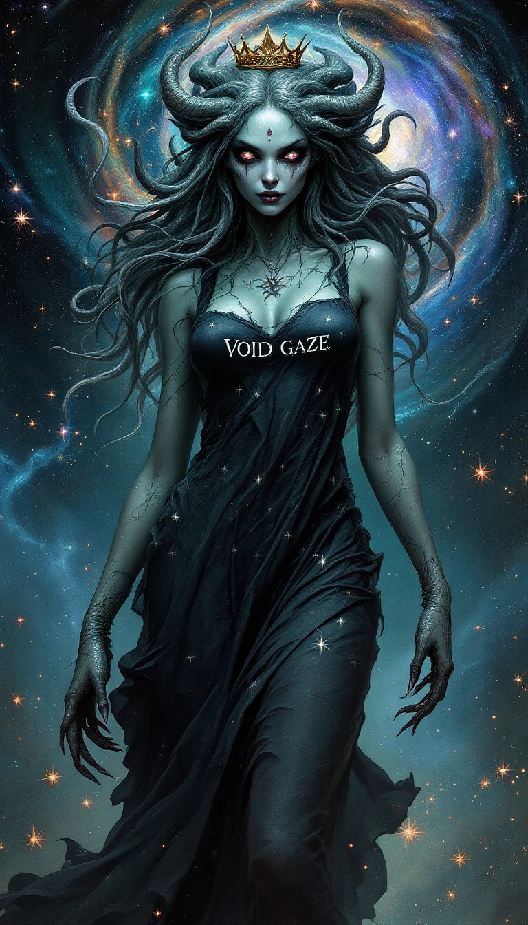 A hyper-realistic portrait of a female cosmic horror with shifting, iridescent skin and long, tentacled hair that writhes with an unsettling grace. She has large, multifaceted eyes that reflect the vastness of space and an unnerving gaze. Her facial expression is both alluring and terrifying. She wears a flowing, sleeveless, tattered black robe that reads "VOID GAZE" across the chest. Her body has an undefined, serpentine build, with strange, shifting proportions, and her arms end in tentacle-like appendages. The cosmic horror has small, shifting star markings on her body, adding to her otherworldly appearance. The background is a swirling, cosmic nebula filled with strange, unidentifiable shapes and eldritch crowns. The texture of the robe should be dark and flowing, resembling old, wet leather. Her skin and hair display an unsettling, organic texture.