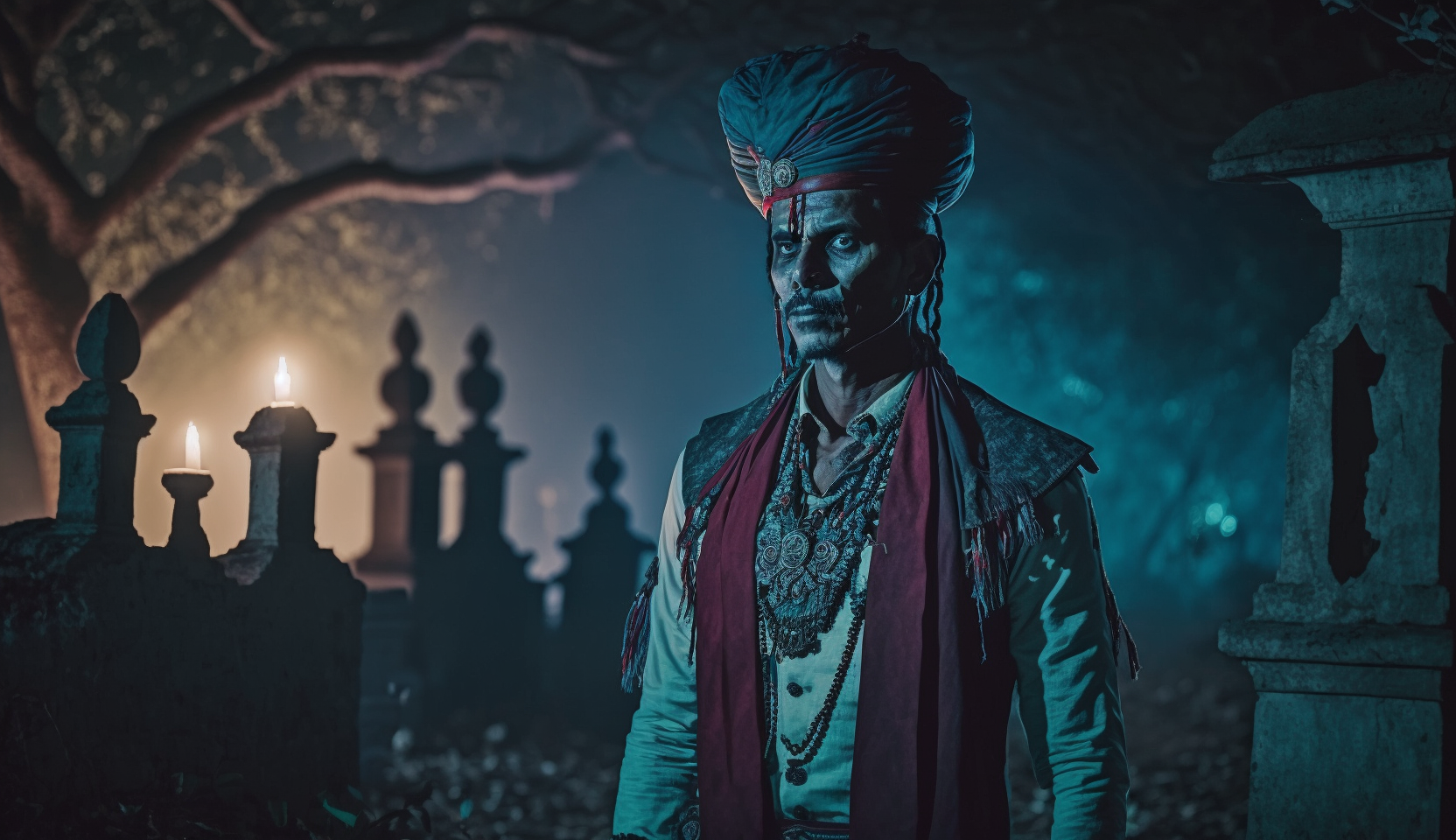 Midjourney prompt: a indian hindu magician in cemetary at night, horr...