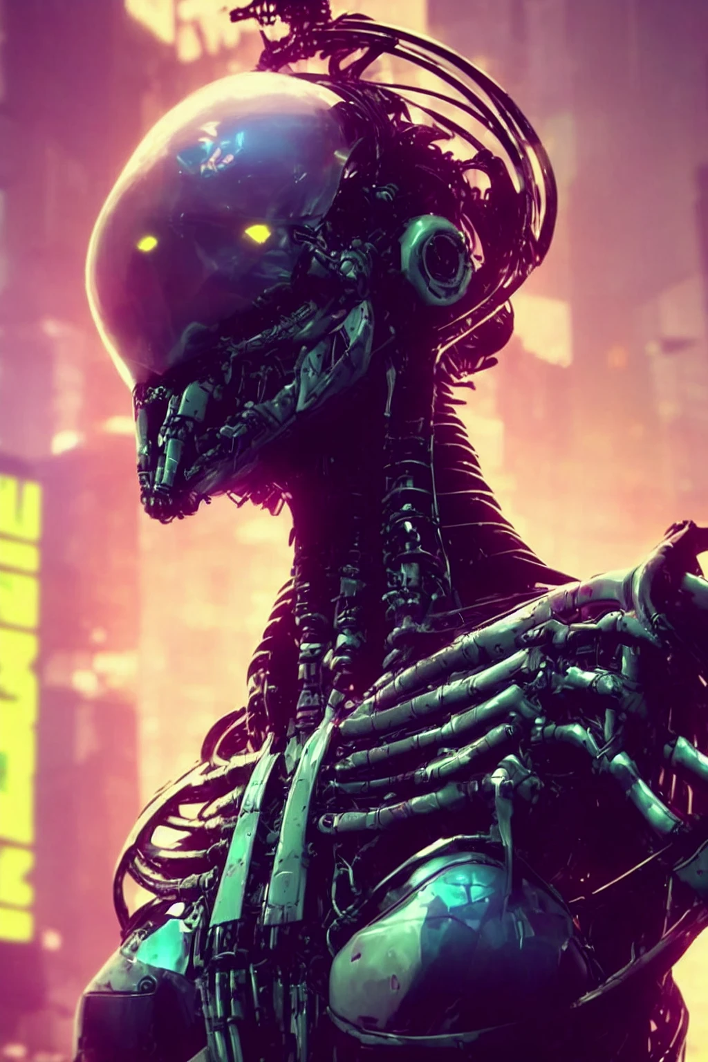 nousr robot, portrait troll full body standing skeleton, in cyberpunk 2077 city, glass rust chipped bones fog oil spiral chaos, gears, intricate, chaos, cybernetic, cyberpunk, artstation, conce