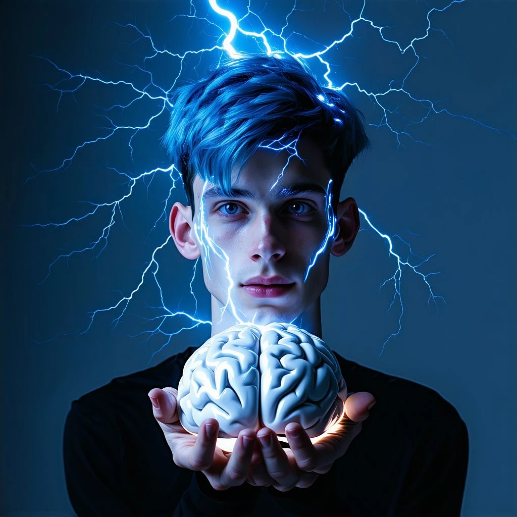 a very skinny college age guy, chopped shag of blue hair, no short, bolts of lightning shooting from the brain easily holds a brain in his hands and presents it proudly to the camera