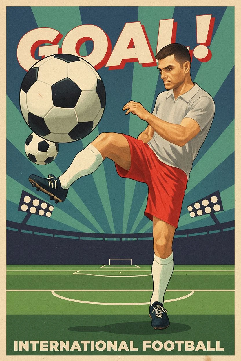Poster style, retro sports illustration. A soccer player in red shorts, gray jersey, and white socks, shown in a dynamic action pose. Striking the ball with a volley, leg fully extended. The ball is flying towards the viewer in perspective. Bold colors, strong contrast, clear silhouette, minimal background, poster effect.