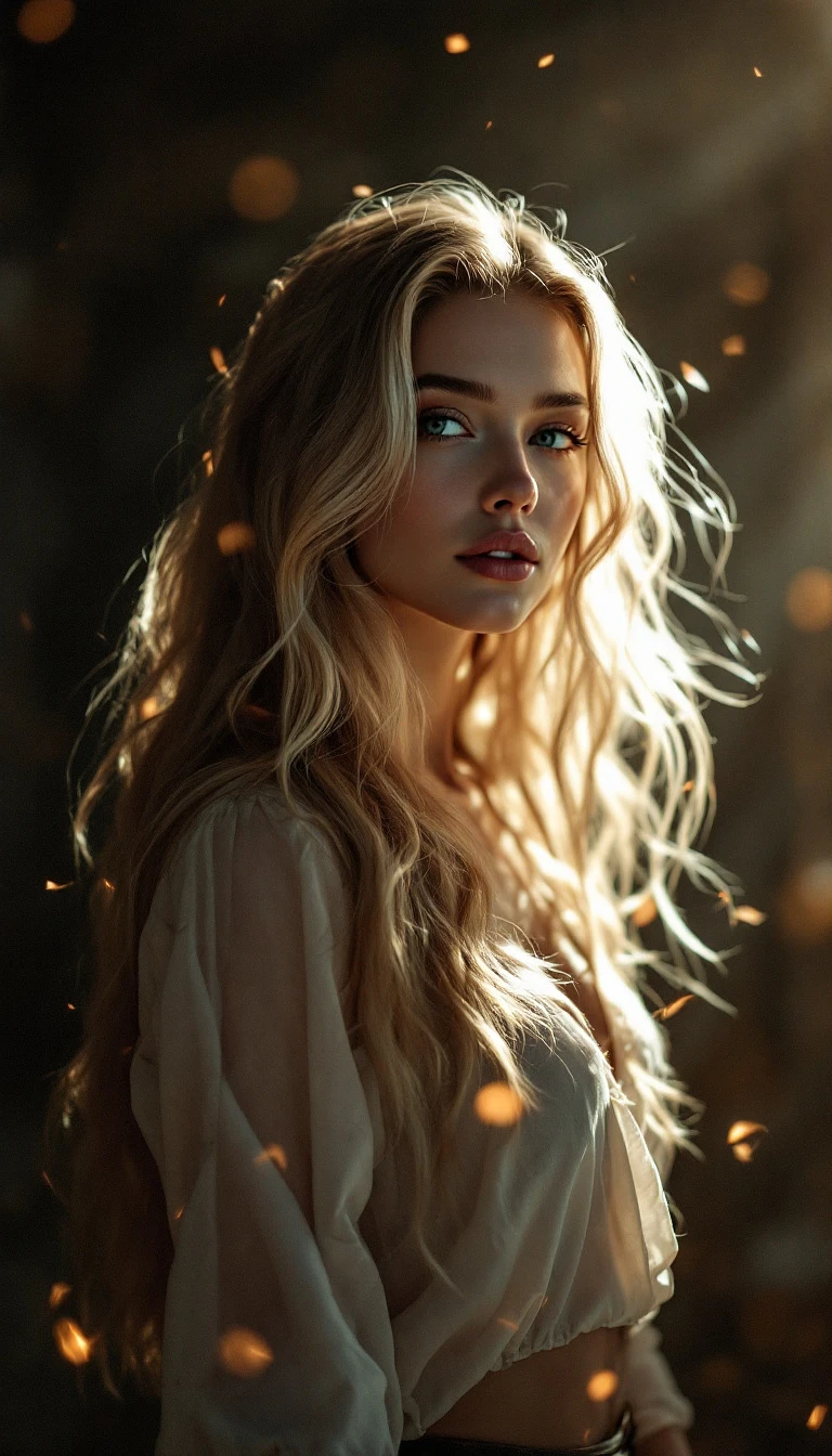 “In a professional fine art photograph, a majestic tableau unfolds with the warm embrace of subtle darkness, where soft lighting perfectly highlights an epic lens glow. The scene is modern and futuristic, capturing a grand atmosphere with natural earth tones that blend seamlessly into the massive colours. Heroic elements subtly whisper through the composition, centred around a striking 21-year-old honey blonde model. Her long, radiant hair cascades with an ethereal glow, embodying the essence of timeless beauty amidst a harmonious symphony of colours and shadows. ”
