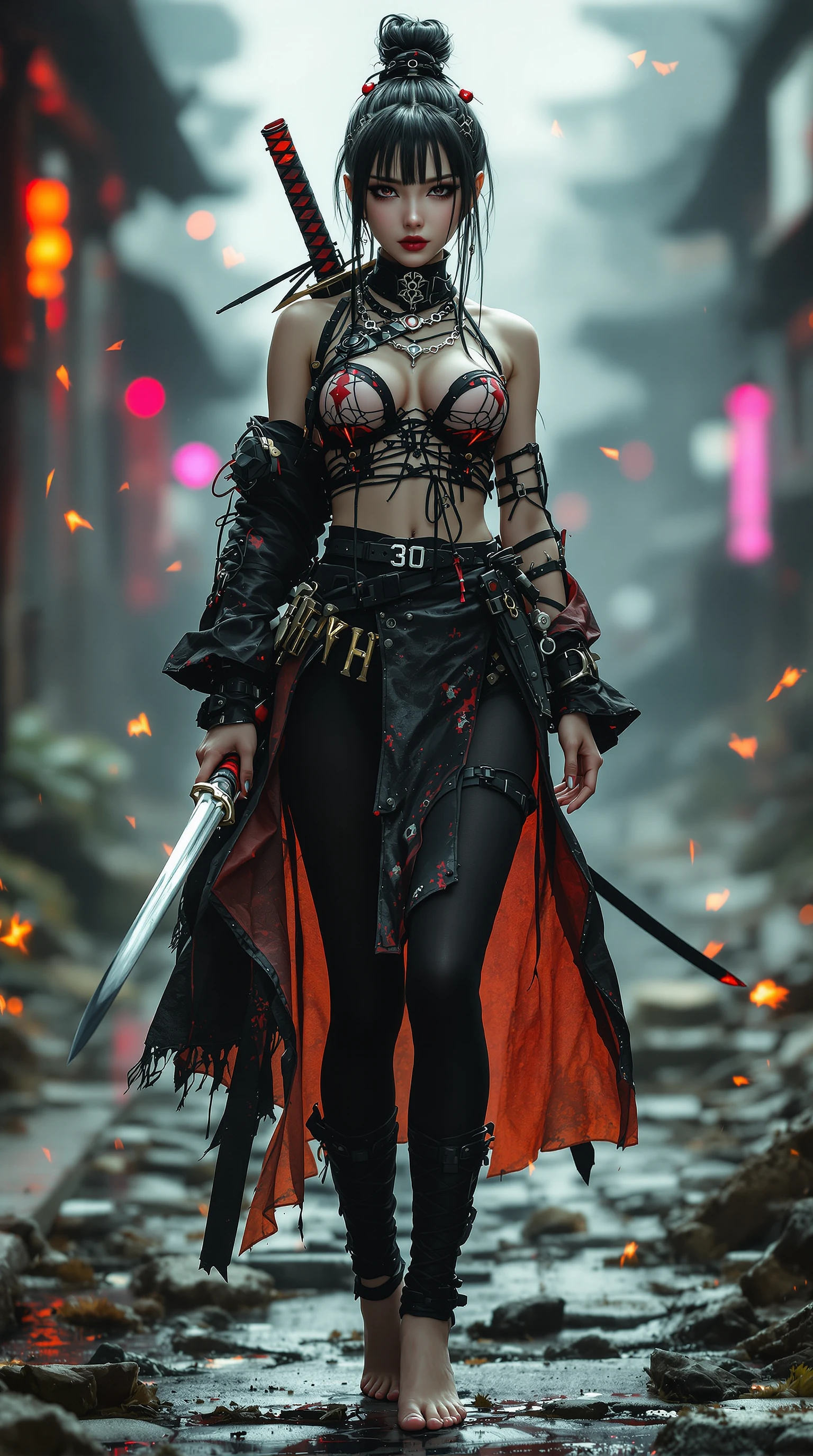 Full body view of a Gorgeous 18 years dystopian Japanese girl wearing dystopian cyberpunk punk emo qipao and black leggings, barefoot (((show foot) )), apocalypse, looking at viewer, high detail, dangerous, katana on sholder