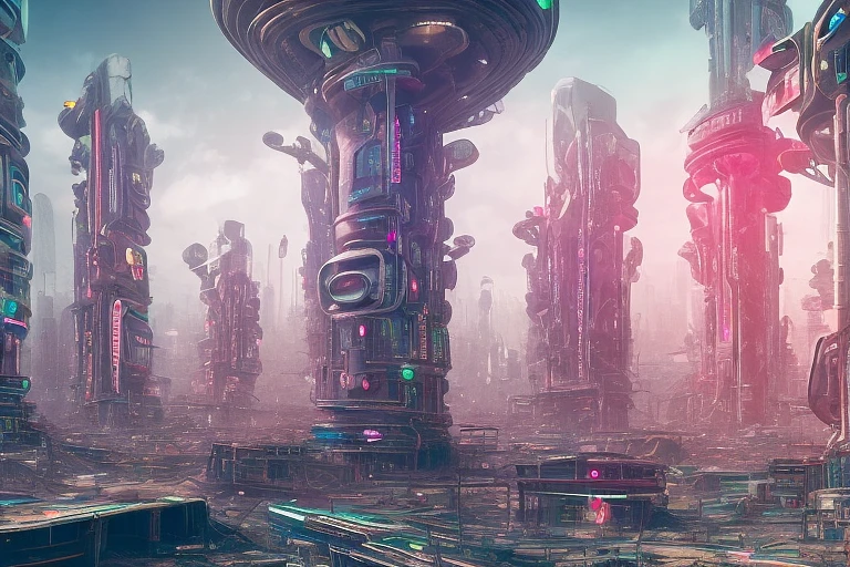 Dystopian ultratechnological futuristic neon city with collapsed buildings, robots citizens living there