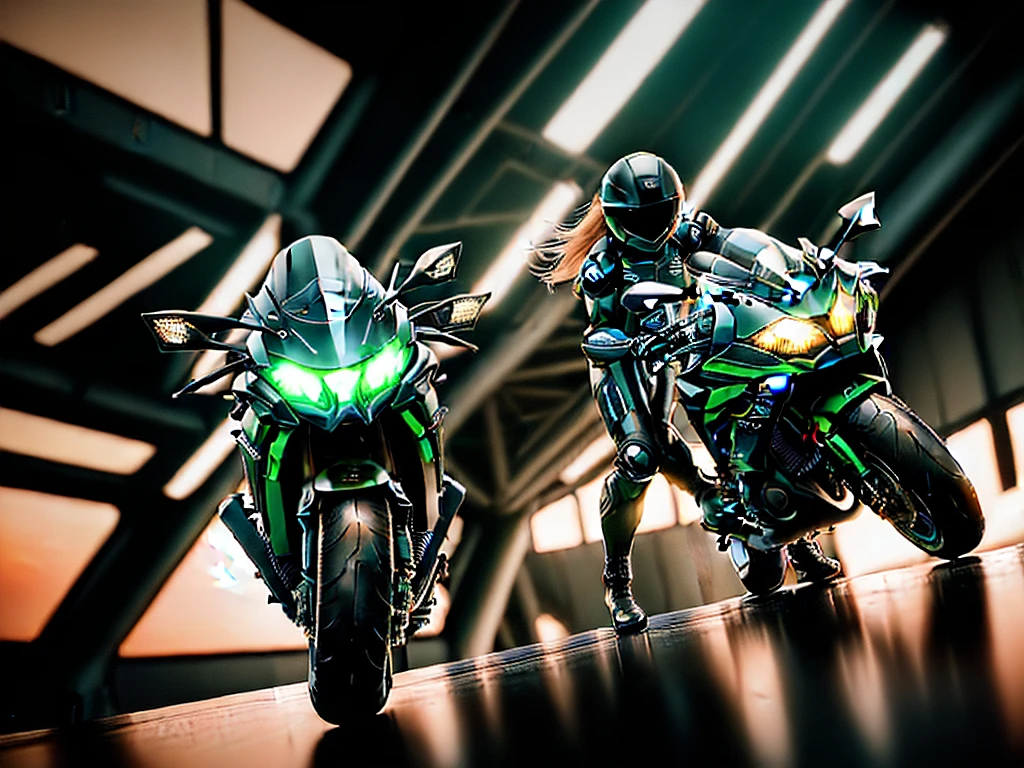 female figure in a black motorcycle suit (jumpsuit) , in a sci-fi flight hangar, riding a Kawasaki ZX1400r, sunset, third-person view from below, lots of fine detail, sci-fi movie style, photography, natural textures, natural light, natural blur, photorealism, cinematic rendering, ray tracing, highest quality, highest detail, Cinematic, Blur Effect, Long Exposure, 8K, Ultra-HD, bold Lighting, Moody Lighting, Cinematic Lighting --q 2 --ar 9:16