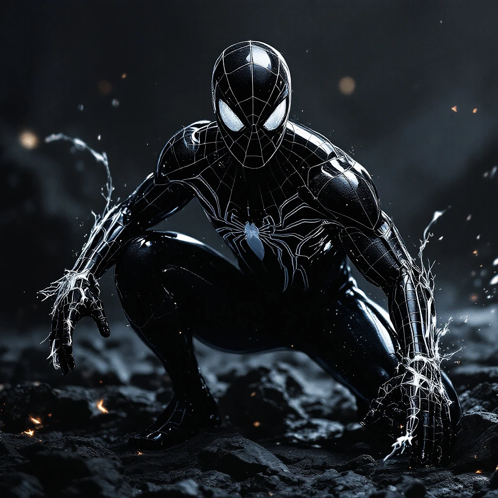 a full body shot of spiderman in his black suit from the comics character concept art by Roberto Ferri, epic shot, intricate details, 4k, uhd, dramatic lighting