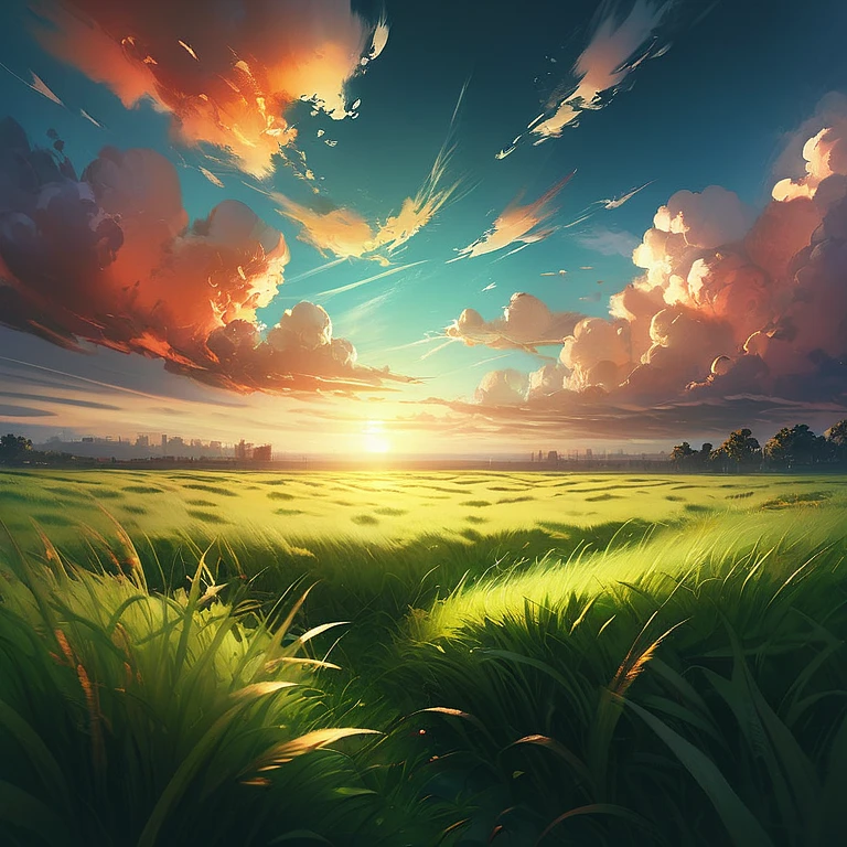 A beautiful grass field, sunset, fluffy clouds, Lighting and shading by Ross Tran