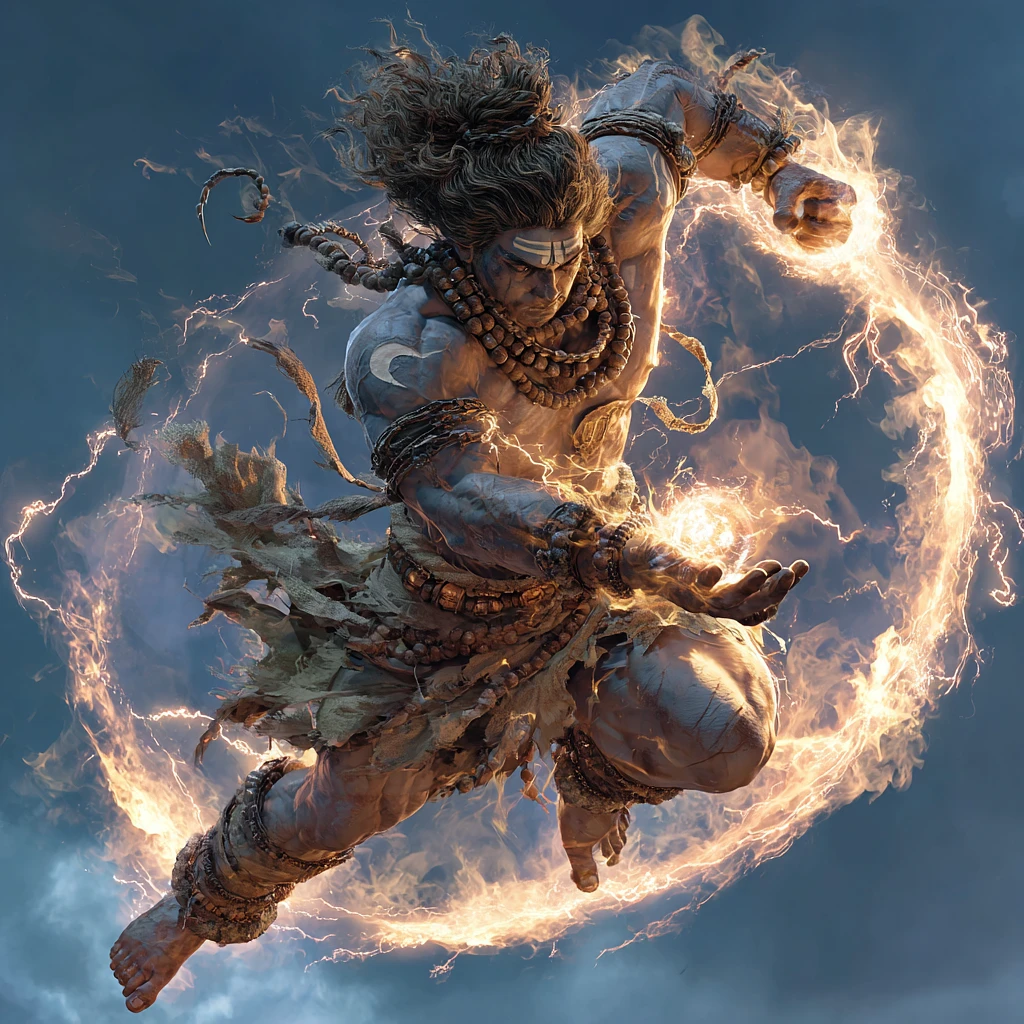 hyperrealistic Lord Shiva performing the Ugra Tandava in a fiery cosmic battlefield, his wrathful energy igniting swirling flames that form a blazing ring around him. His matted hair flies wildly, bearing the crescent moon and the sacred Ganga, while a third eye glows intensely on his forehead. His body is smeared with ash, adorned with serpents, skull garlands, and rudraksha beads. He dances with immense force--one foot raised, the other crushing the demon of ignorance. His arms, in multiple poses, wield the damaru and trident, radiating divine fury. Lightning cracks across a storm-filled sky as mountains tremble in the distance. The air vibrates with cosmic rage and destruction, as the universe witnesses the terrifying power of Mahadeva’s Ugra Tandava. --v 7. 0 --s 300
