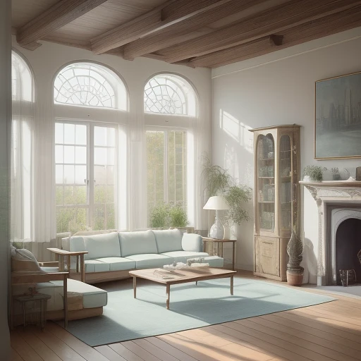 High resolution photography interior design, dreamy sunken living room conversation pit, wooden floor, small windows opening onto the garden, bauhaus furniture and decoration, high ceiling, beige blue salmon pastel palette, interior design magazine, cozy atmosphere; 8k, intricate detail, photorealistic, realistic light, wide angle, kinkfolk photography, A+D architecture