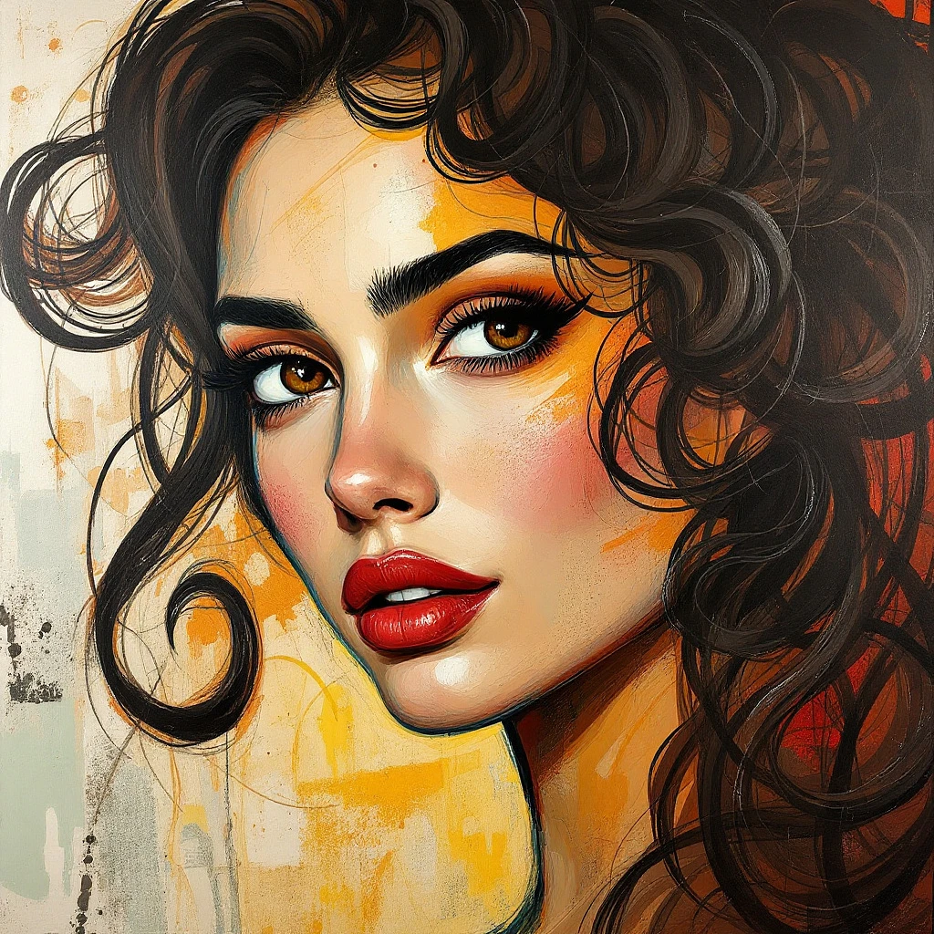 abstract painting of a Latina woman with hazel brown, hair, in the style of flawing coil curls, Pablo Picasso, large canvas paintings, hard edge painter, elegant, emotive faces, hispanicore, strong facial expression --ar 1:2 --stylize 750