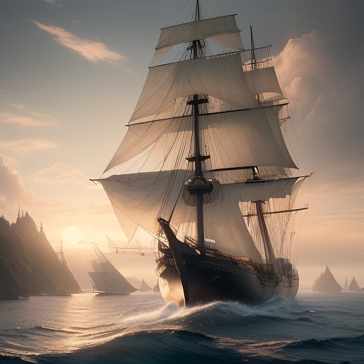 Photo of a ultra realistic sailing ship, dramatic light, pale sunrise, cinematic lighting, battered, low angle, trending on artstation, 4k, hyper realistic, focused, extreme details, unreal engine 5, cinematic, masterpiece, art by studio ghibli, intricate artwork by john william turner