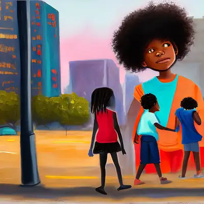Create an oil painting of an urban scene focusing on a child with hopeful eyes gazing at a “Black Lives Matter” sign. Use warm and optimistic colors to convey a narrative of hope amidst challenges. In the foreground, depict two teenagers displaying intense emotions, with one possibly armed, adding a layer of complexity to the scene. The background should feature a detailed cityscape, skillfully playing with shadows and light to enhance the depth of the scene. Employ traditional oil painting techniques to achieve deep emotional expression and detailed textures, particularly in the city elements. Use a warm color palette to reinforce the theme of optimism. –ar 1:1 –v 6. 0 –style raw