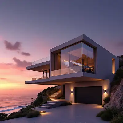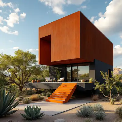 vista frontal de un terreno vacío que se transforma gradualmente en una sola casa pequeña de diseño moderno minimalista con concreto y madera en proceso de construcción. transiciones suaves, fundiendo acera y carport de losa plana, vegetacion de clima cálido, palmeras y montañas en el fondo