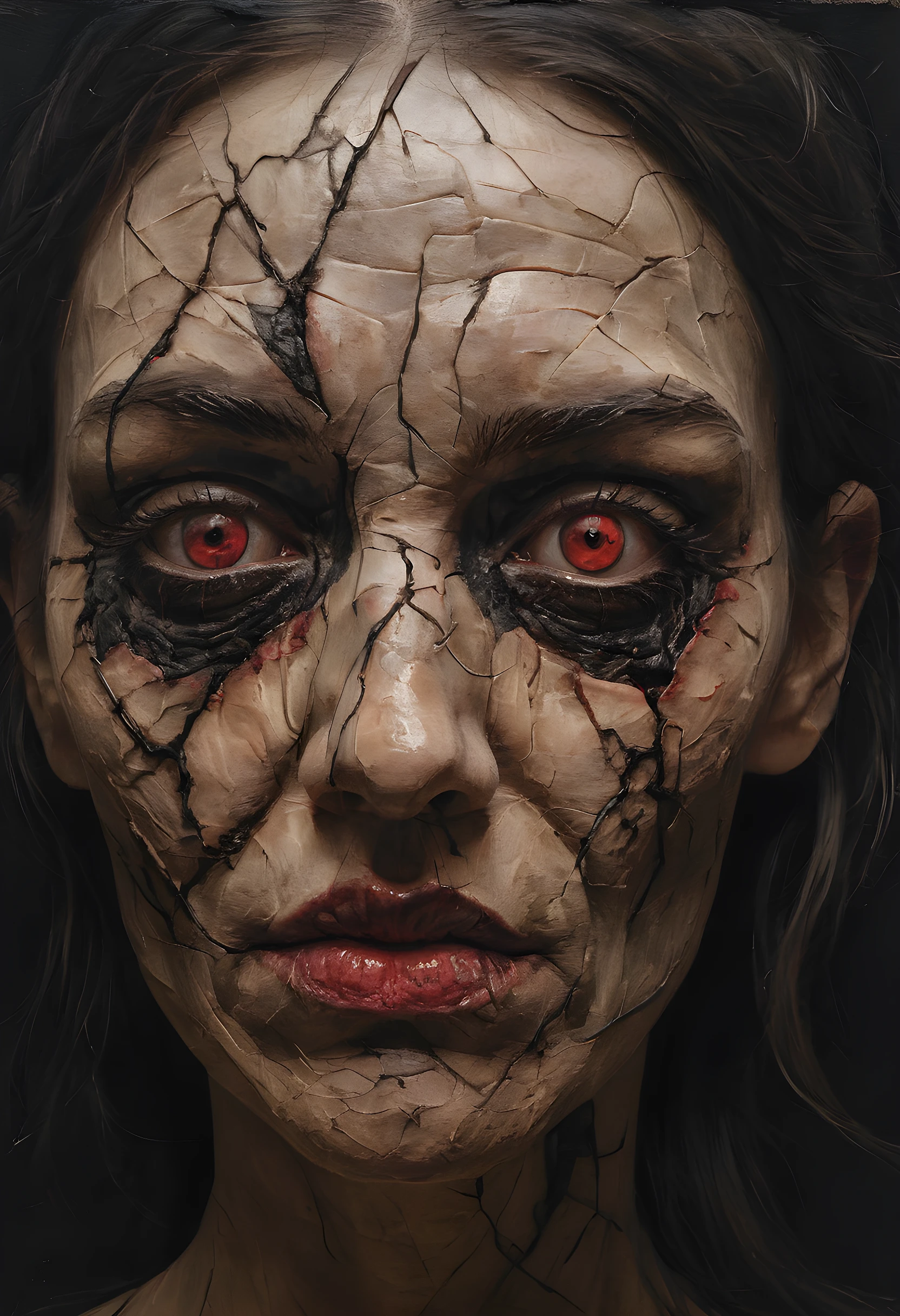 A visceral, impasto-laden portrait capturing the elusive visage of the enigmatic JigSaw. Thick, gritty brushstrokes of charcoal and soot-black hues sculpt the haunting countenance - a pallid visage of jagged, unsettling geometry, the sinister brow and hollow, piercing eyes conveying an aura of unnerving menace. Impasto peaks and valleys of crimson and ochre sanguine accents lend a nightmarish, almost flayed quality to the skin, while the terse, compressed lips are rendered in a chilling rictus of grim determination. The captivating, unsettling portrait is imbued with a palpable sense of brooding, malevolent power that seems to emanate from the canvas, daring the viewer to unravel its twisted mysteries.