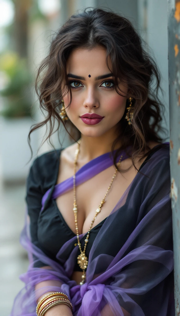 Polaroid camera, Hayley Atwell , 24-30 years old, Indian hair style, trying to love, inhaled chest, wide open eyes, A plus curvy shaped body structure, showing bangles on hand, bindi, high-quality photo portrait, environmental, double eyelid --ar 34:65 --style raw, indian ascent, flying kiss, feeling happy, beautiful legs, wearing violet transparent sari with black silk blouse, includes full body.