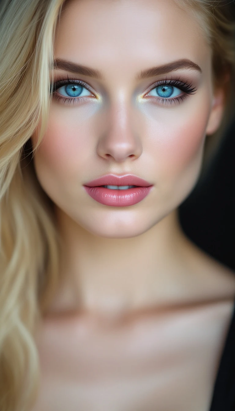 "Image is a high resolution portrait photograph featuring a woman with striking facial features. She has long, flowing blonde hair that frames her face, and her skin is fair and smooth like alabaster. Her eyes are a vivid blue, standing out prominently against her complexion. The lighting is soft, highlighting her high cheekbones and full lips, which are slightly parted. The background is dark, creating a contrast that emphasises her features. Her expression is calm and direct, engaging the viewer with an intense gaze. The overall composition is centred, with the subject occupying most of the frame, creating a focused and intimate portrait. "