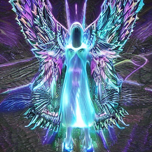 a photo of 8k ultra realistic archangel with 6 wings, full body, intricate purple and blue neon 2