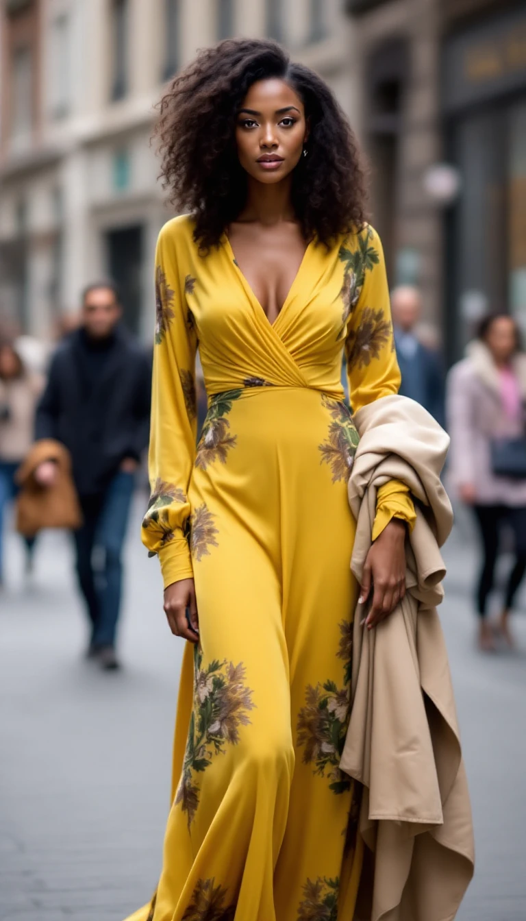 The image features a woman standing on a street in an urban setting. She is wearing a long, flowing dress that is mostly yellow with some green and brown patterns. The dress has a draped, wrap-style design with long sleeves and a deep V-neckline. She is holding the dress with one hand, pulling it slightly to her side. Her other hand is holding a light-colored jacket or coat. Her hair is styled in voluminous curls, cascading over her shoulders. In the background, other people are walking, and there are buildings with large windows. The setting appears to be a city with a European architectural style.
