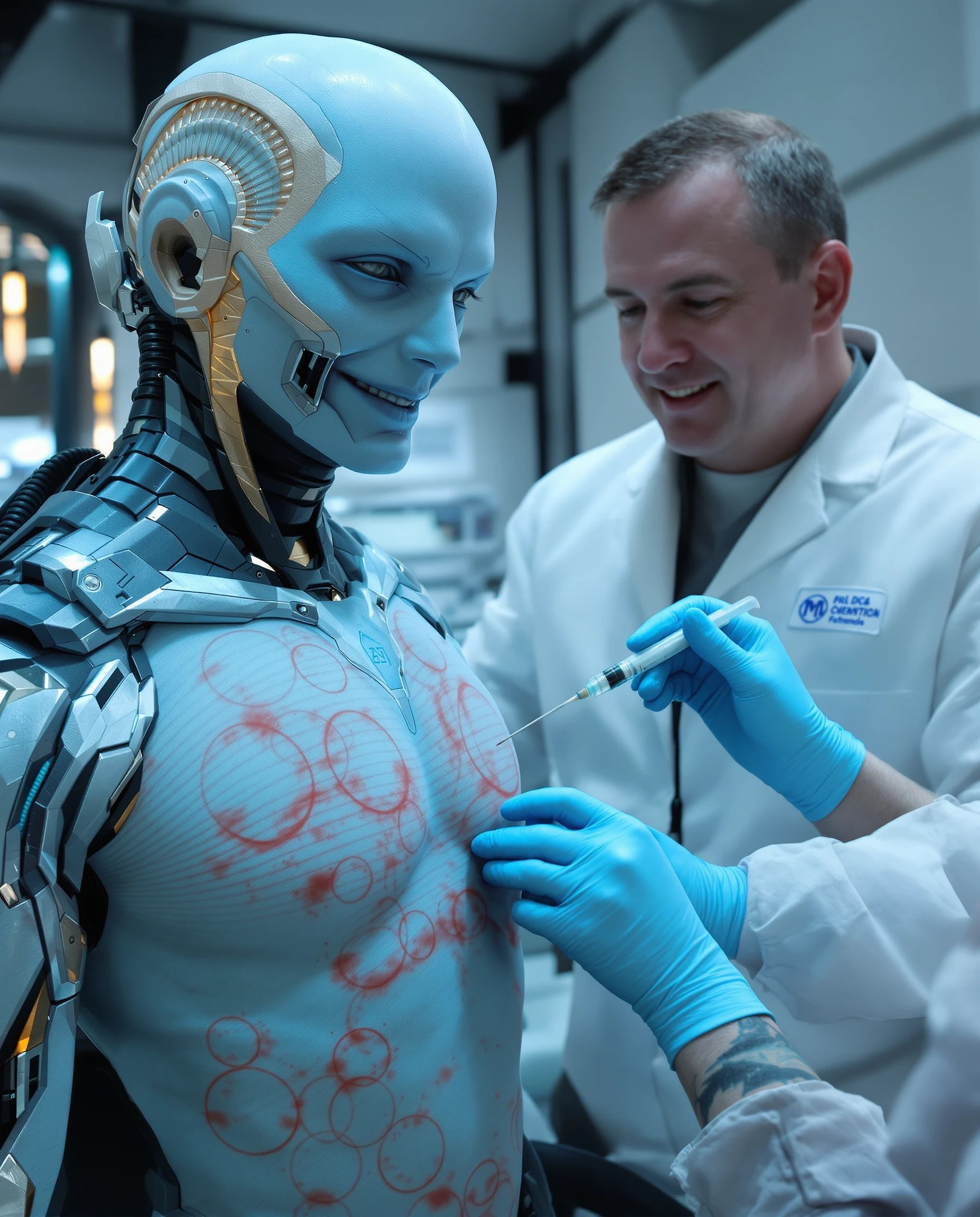 Create a dystopian futuristic science fiction style scene in which Bynar Vincic, a humanoid, with blue vampire-pale skin, is being injected in the stomach by a Doctor Glenn, MD. The Doctor swabs the humanoid’s lower abs, producing telltale red-orange circles from the povidone-iodine swab. Doctor Glenn then injects Vincic's left side. The corners of Vincic's piercing grey eyes squeeze together as he smiles. The injection contains FXZ-77, a gene therapy made of plasmids which lengthens the human lifespan. Bynar Vincic has a tattoo across his chest. Photorealistic, hyper-detailed, futuristic.