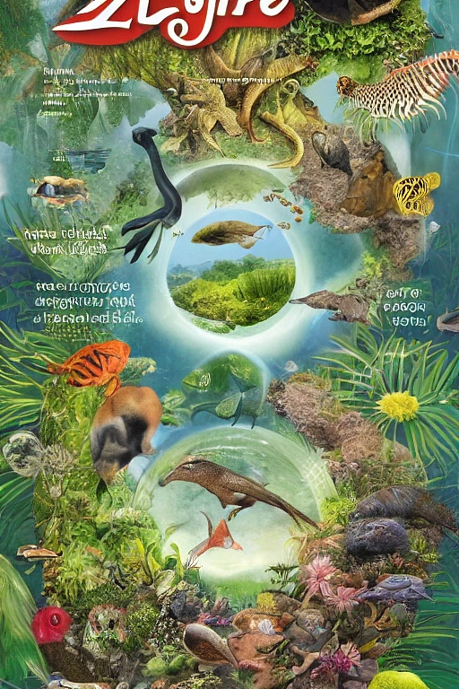 “LIFE”: zoological fantasy ecosystem infographics, perfect magazine cover layout with typography, annotations, and title encased in the middle of the upper third, in the style of Elena Masci —ar 5:7 --s 5000 --q 2