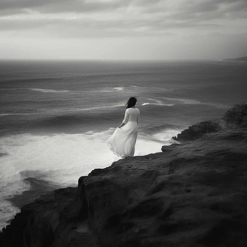 a woman wearing a white gown standing near the edge of a cliff, facing the restless ocean, big waves, black and white, scary and dark, photorealistic, detail rich, 16k, atmospheric, photograph, cinematic, shot on Hasselblad H4D 200MS Digital Camera, Mitakon Speedmaster 65mm f/1. 4 XCD, Fresnel lighting, --v 5