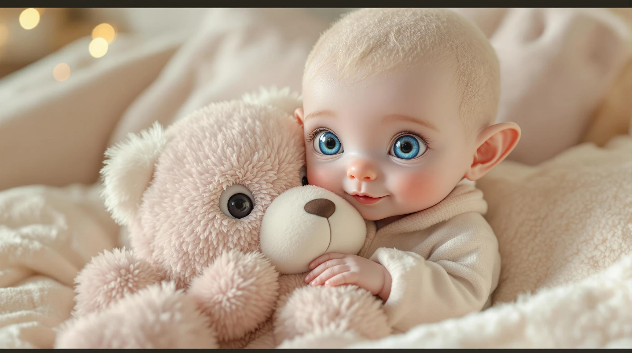 a beautiful and cute alien babie, with bright blue eyes, wearing adorable pyjamas, hugging and playing with a plush animal, the plush animal is much larger than the babie, set against a soft, cream and white tone background that adds warmth and coziness to the scene, the atmosphere is very charming, and full of happiness, uhd photorealistic quality