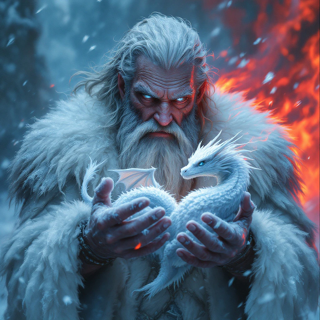An ancient, weathered man with a thick, frost-covered beard and white fur cloak holds a small, white dragon in his hands. The scene is set in a harsh, snowy environment with swirling icy winds around him. The man’s piercing blue eyes gaze intently at the dragon, which appears both powerful and delicate. The background is split between a cold, blue-toned blizzard and a contrasting fiery red glow, symbolizing a clash of elemental forces. overall mood is mystical & intense