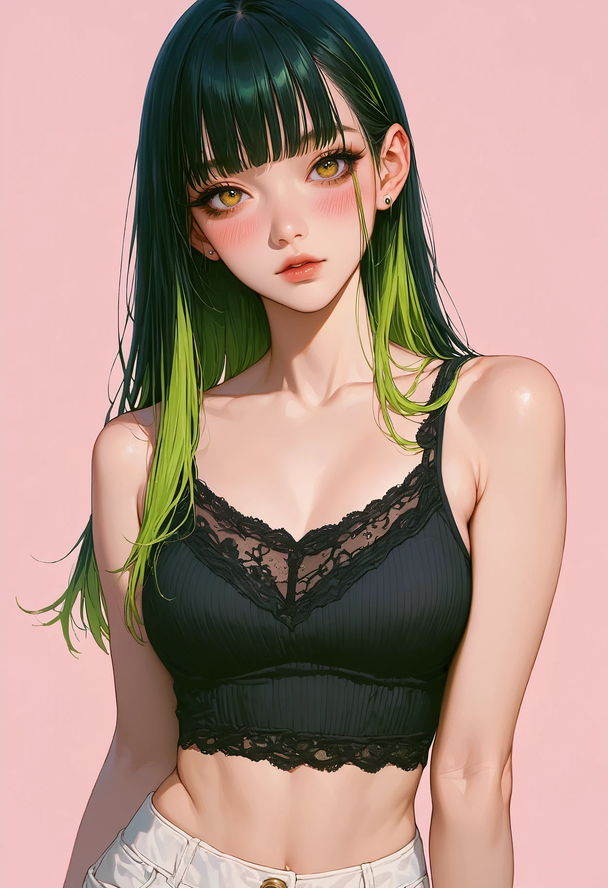 score_9, score_8_up, score_7_up, 1girl, solo, two tone hair, black and green hair, shoulder length straight hair, blunt bangs, ear, hair behind ear, yellow eyes, black eye shadow, black eye liner, blush, perfecteyes, eyebrows, normal lips, natural color lips, lace tank top, bare shoulders, midriff, white shorts, pink background, looking at viewer, facing viewer, cowboy body shot, high resolution, cinematic, extremely detailed