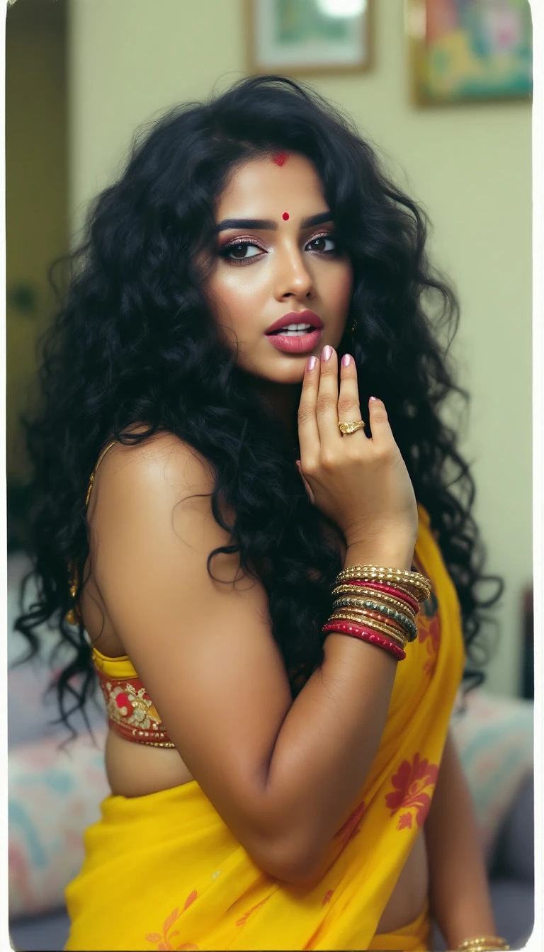 Naina, full body, biting her lip, 18-22 years old, Black curly hair, Indian hair style, saree yellow, trying to removing the bra, inhaled chest, wide open eyes, A plus curvy shaped body structure, wearing Golden bangles on hand, bindi, high-quality photo portrait, shot on a Polaroid camera, double eyelid --ar 34:65 --style raw with showing her belly