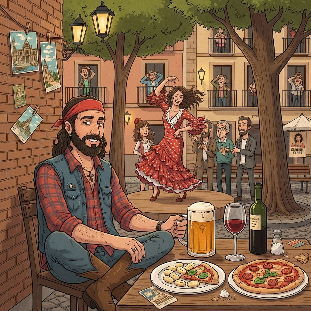 Hombre andaluz alternativo, estilo blusero, sentado en un bar al aire libre en la Alameda de Sevilla, con expresión nostálgica pero jovial. Frente a él hay una cerveza, un plato de gnocchi y vino de la Toscana. Postales de la Fontana di Trevi y Costa Amalfitana decoran la mesa o la pared del bar, y una pizza margarita como guiño a la letra. Al fondo, una bailaora de flamenco bailando después de una borrachera, transmitiendo alegría y movimiento. Varias personas en el bar haciendo gestos italianos exagerados y conversando en italiano, reforzando la referencia de la letra. Vecinos mirando desde ventanas y balcones con expresiones divertidas, galletas y sal sobre las mesas como guiño cómico. Pequeño escenario o cartel en el bar con un tributo a Raffaella Carrà, de forma sutil. Elementos típicos de la Alameda: árboles grandes, farolas características, bancos de madera, pavimento clásico sevillano. Luces cálidas del bar iluminan la escena, colores vivos y equilibrados. Estilo realistic cartoon, composición dinámica mostrando la interacción del protagonista con el entorno, sensación de humor, nostalgia y fiesta.