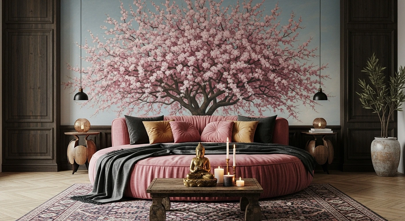 A extra large wall mural of an realistic painting on the walls, featuring a real blossem tree in pink. In front is a extreme pink velvet extra large round 7 person bed with cushions made from rich fabric in warm tones, a Balinese vintage coffee table with candles, golden buddha, and dark wood paneling around it. The interior design style is minimalist, with a Balinese area rug under the verry extreem big round bed, moody lighting, verry big round bedroom, ornate details, and rich textures in a symmetrical composition. --ar 103:128 --s 250 --v 6. 0 --style raw