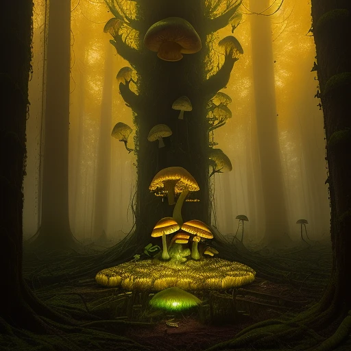 a photography of a post-apocalyptic forest with towering champignon fungi over 20 meters tall emitting a strong yellow light, and the ground covered entirely by Ganoderma. The scene is eerie and surreal, illuminated by the intense yellow glow of the fungi against the dim, ambient light of the Ganoderma covering the ground like a thick, luminous carpet
