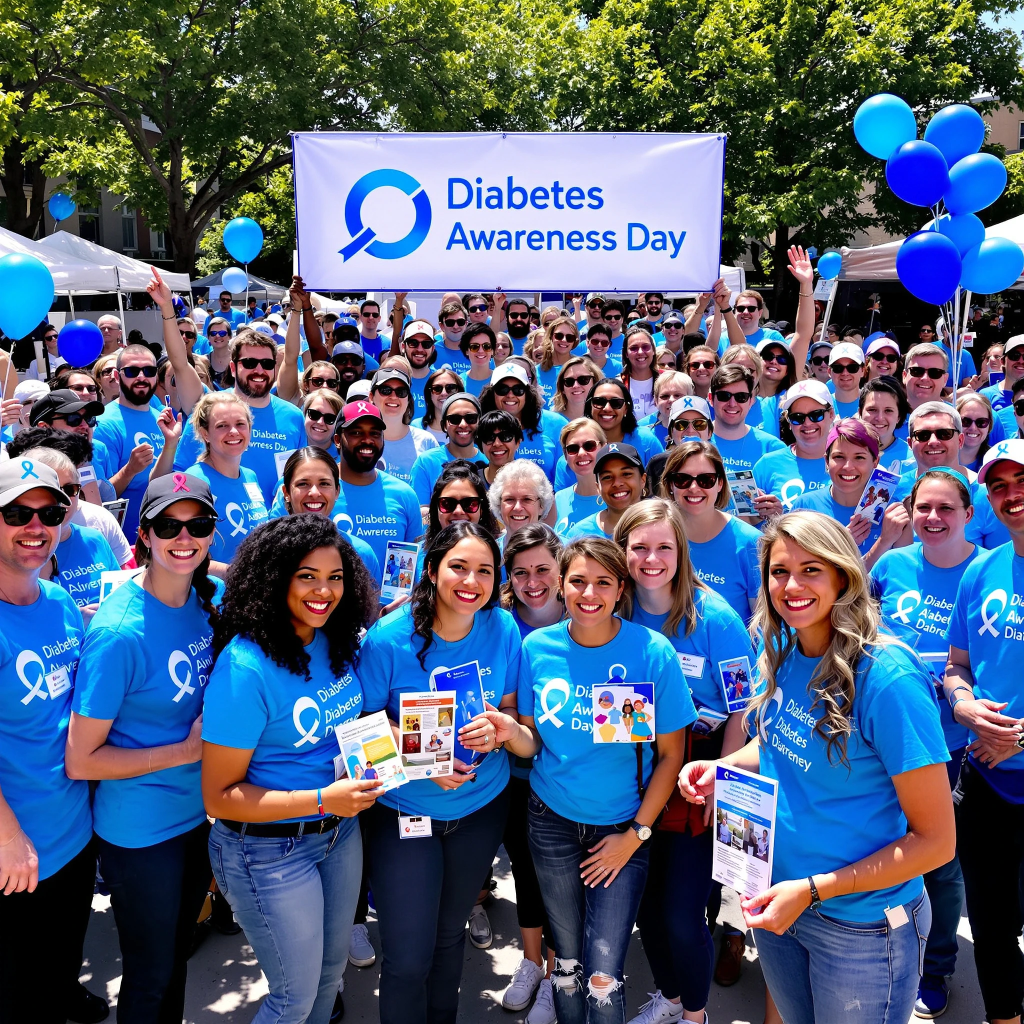 A vibrant and uplifting scene celebrating Diabetes Awareness Day, featuring a diverse group of people of different ages and backgrounds gathered together outdoors, wearing blue clothing and holding blue ribbons, the universal symbol for diabetes awareness. In the background, a large banner reads 'Diabetes Awareness Day' with a stylized blue circle logo. The atmosphere is hopeful and supportive, with bright natural sunlight illuminating smiling faces. Balloons and informational booths are visible, and some participants are holding educational pamphlets. The color scheme is dominated by shades of blue and white, conveying a sense of unity and health.