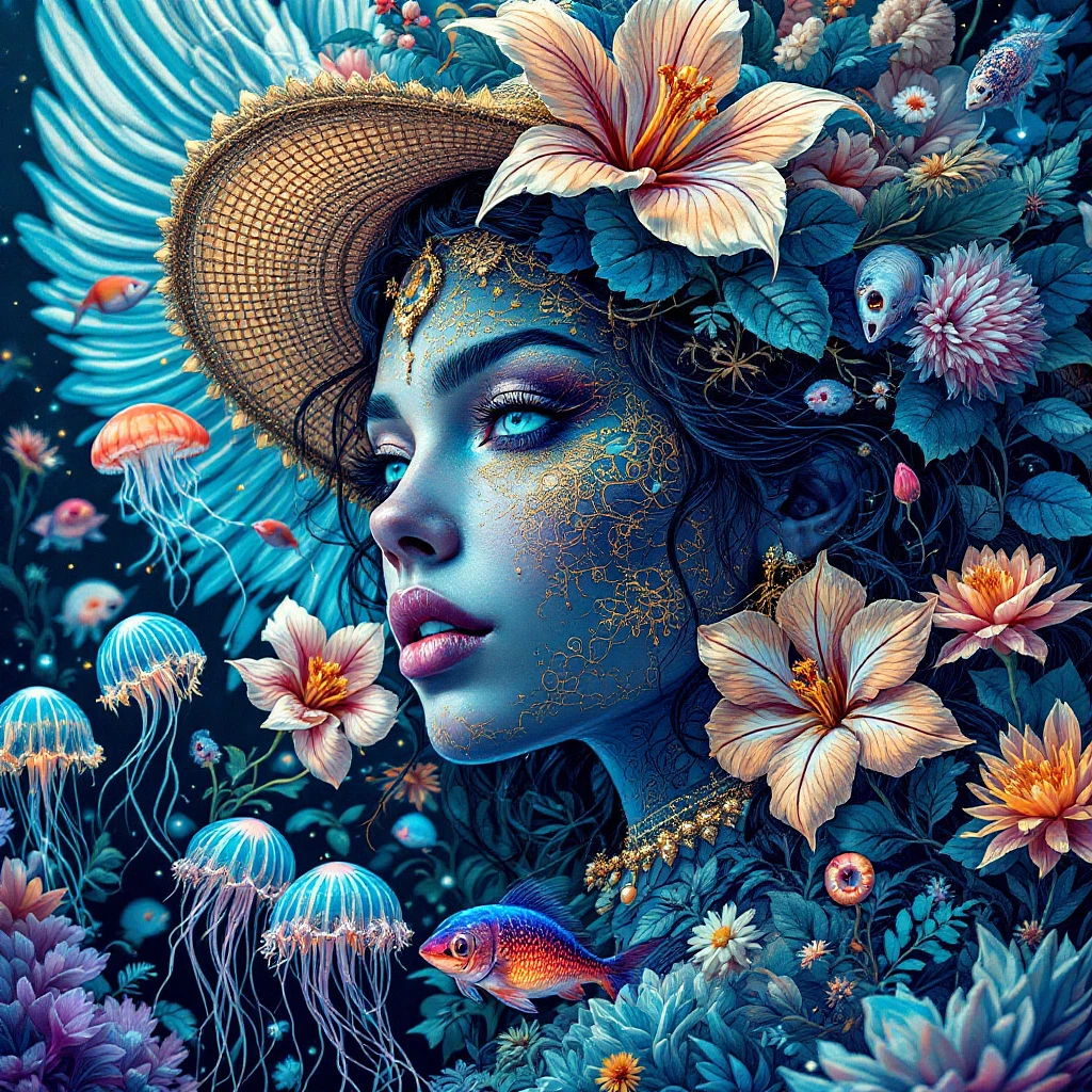 In pen and ink, a close-up portrait of an angel-winged Goddess with gold earrings and a Summer hat, jellyfish, Goddess head, nautilus, orchid, exotic fish, and bioluminescent creatures, intricate. High Octane render, symmetrical artwork, Trippy. psychedilic cinematic, hyper-realism, high detail, octane render, 8k.
