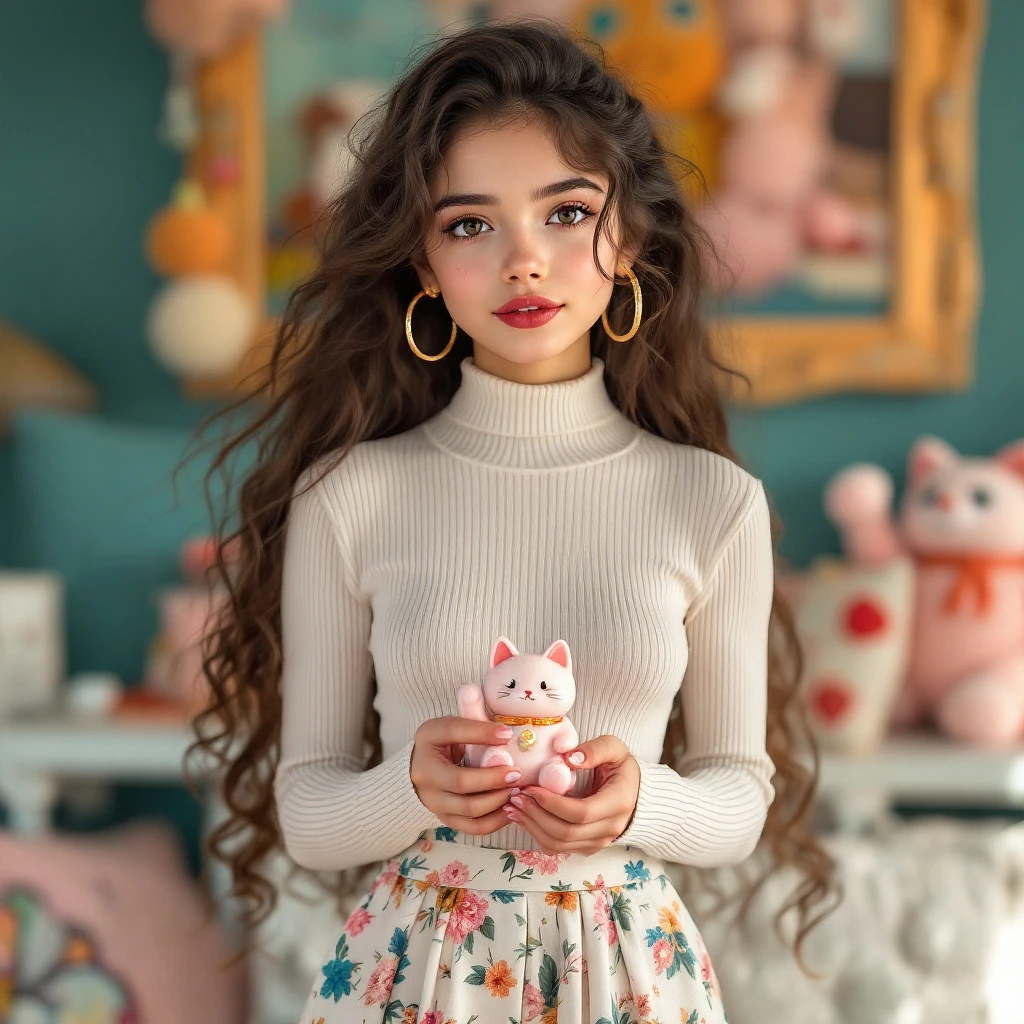 A beautiful teen girl, bright brown eyes, red lips, brown hair so long and curly, detailed intricate and flawless, wearing a Ekouaer Women's Ribbed Long Sleeve Turtleneck Shirt tucked into a Vintage Pleated Floral A-Line Midi Skirt with Pockets, with Beessbest High-Gloss Brightening Powder Spray Body Powder Spray Glitter Powder sprayed on, big golden hoop earrings, holding a Mechanical Keycap Fidgets Clicky Cat / 4 Switches / Pink in her cool room with Puff Ball Pillow Colors: teal, light pink, orange in the background
