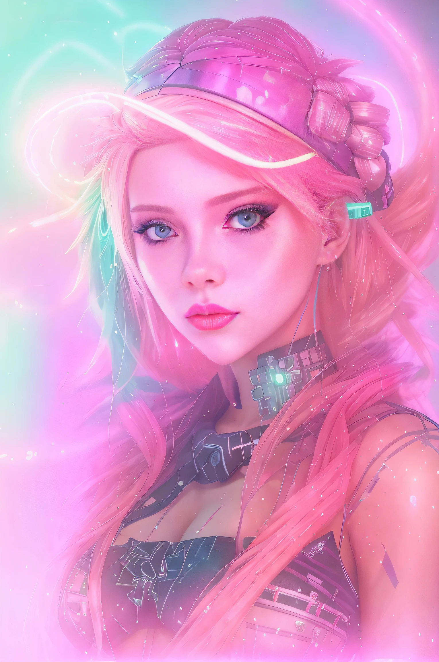 a close up of a woman with a hat and neon hair, glowwave girl portrait, digital cyberpunk anime art, the cyberpunk girl portrait, bright cyberpunk glow, cyberpunk art style, cyberpunk beautiful girl, glitchpunk girl, cyberpunk themed art, cyberpunk artstyle, cyberpunk anime girl, rossdraws cartoon vibrant, akali, cyberpunk portrait, digital cyberpunk - anime art