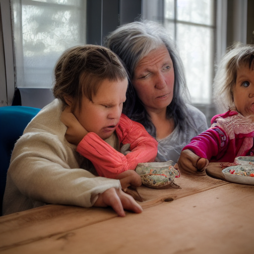 Stable Diffusion prompt: Middle aged women seated at table with two young c...