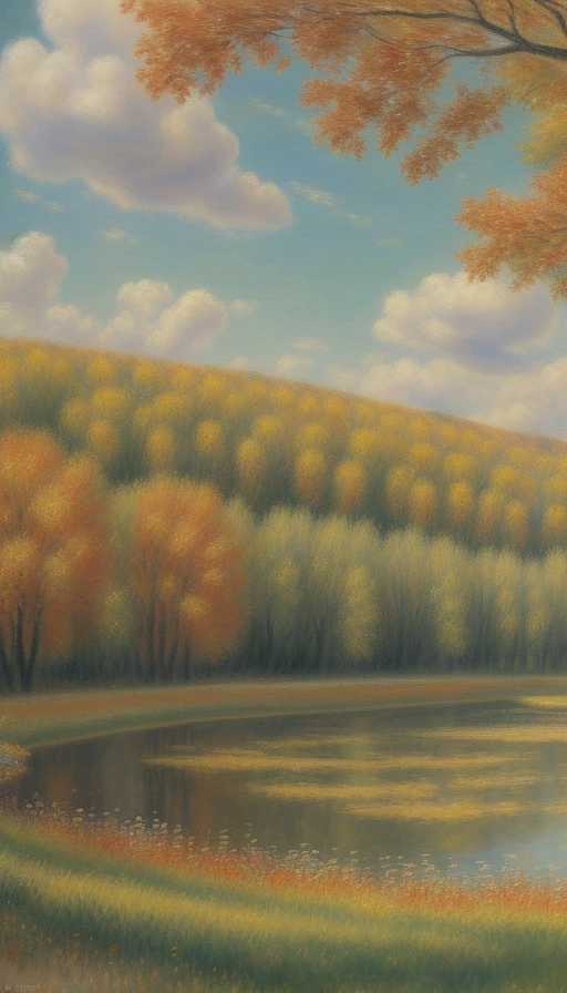 a hyper-realistic painting in the style of Renoir featuring a French meadow in Autumn, mid-angle, 4k, true colors, some puffy clouds and trees changing colors to fall. A water course can be seen snaking through the trees here and there.