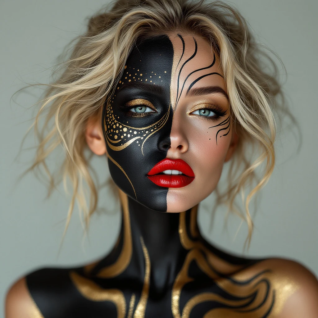 An image of a woman with a hyperrealistic style, showcasing an elaborate body paint design. The skin should be painted in segments of black, gold, and black, with patterns that mimic flowing lines and dots. The face features an asymmetrical mask-like effect, with one eye highlighted in gold and the other in black, complemented by matching eyeshadow. The lips are a vibrant red, contrasting with the face paint. The figure's blonde hair is tousled, enhancing the fantastical element. The image should blend the precision of hyperrealism with the creativity of fantasy body art.