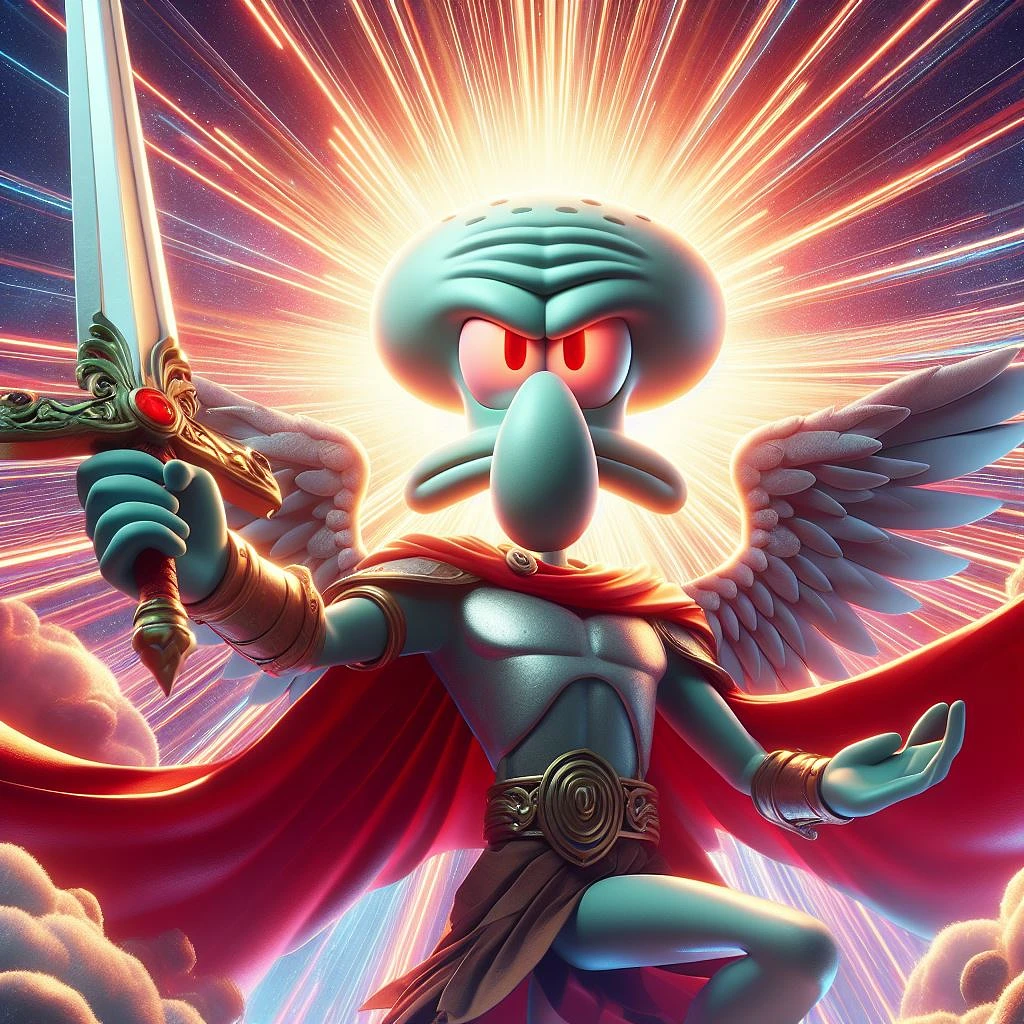 Squidward is the mightiest god with a sword, red eyes, heroic pose, divine and celestial light, masterpiece, octane render, 8k, raytracing
