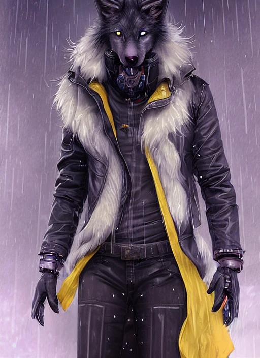 award winning beautiful portrait commission of a male furry anthro albino wolf fursona with a tail and a cute beautiful attractive detailed furry face wearing stylish black and yellow cyberpunk biker clothes in a cyberpunk city at night while it rains. Character design by charlie bowater, ross tran, artgerm, and makoto shinkai, detailed, inked, western comic book art