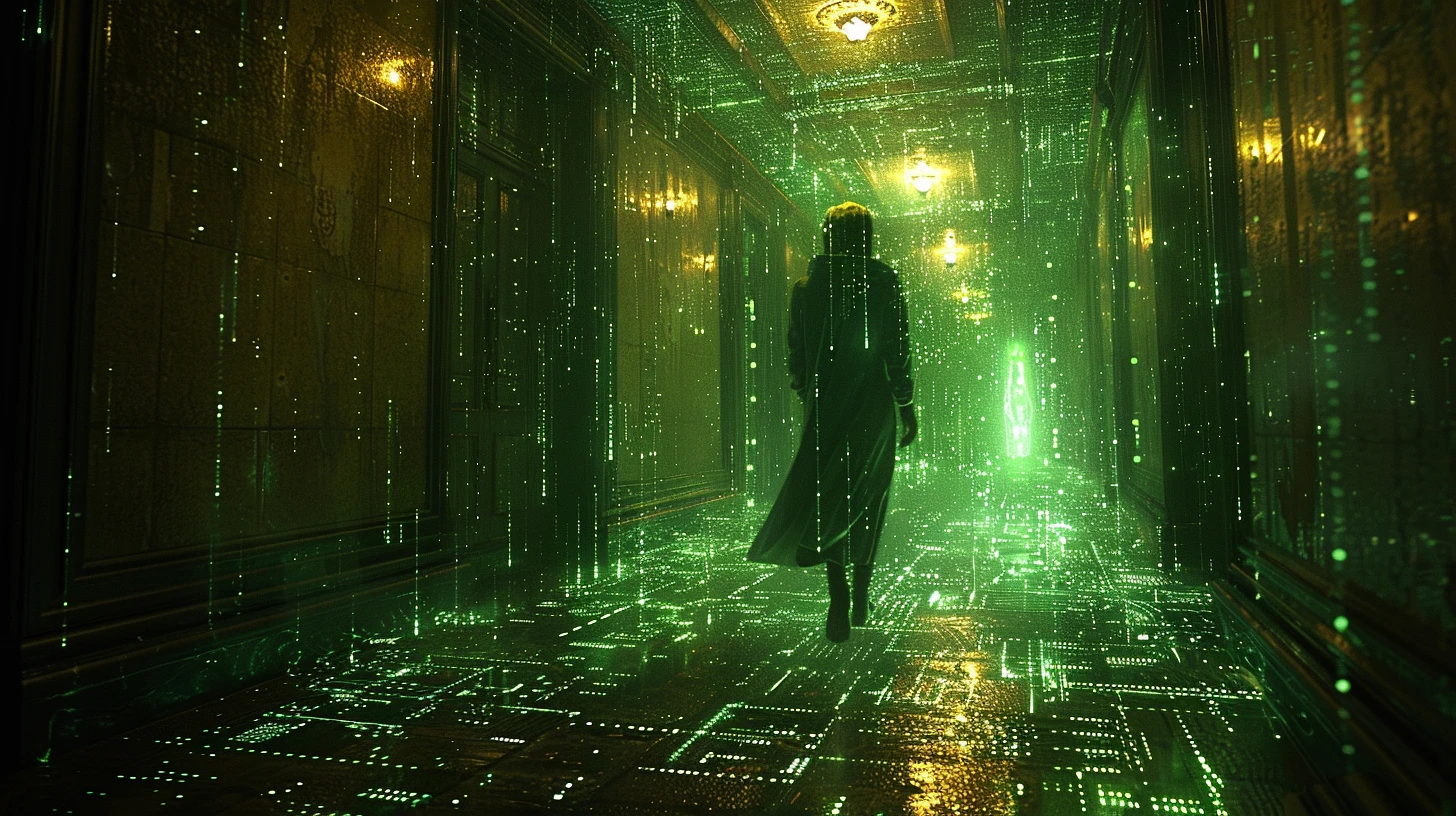 A scene from the Matrix world with digital rain -- human batteries -- sentient machines -- neon green -- deep blue -- stark black -- cyberpunk dystopia style -- digital surrealism -- geometric patterns -- fractal code structures -- glitchy and pixelated reality textures -- cascading data streams -- interconnected neural networks -- layered reality with blurred boundaries between real and virtual -- hyper-realistic digital construct --v 6 --ar 16:9 --s 750 --q 2 --style raw --c 25 --chaos 15