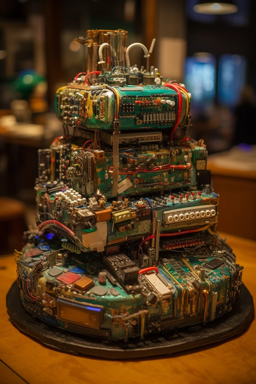 A crazy wedding cake with detailed descriptions about its design, flavor, and toppings, set in a robotic warehouse surrounded by computer parts and cables. The atmosphere is joyful, celebratory, and full of love and excitement. The cake should be realized as a high-resolution photograph, captured with a DSLR camera using a macro lens and aperture settings of f/2. 8. --ar 2:3