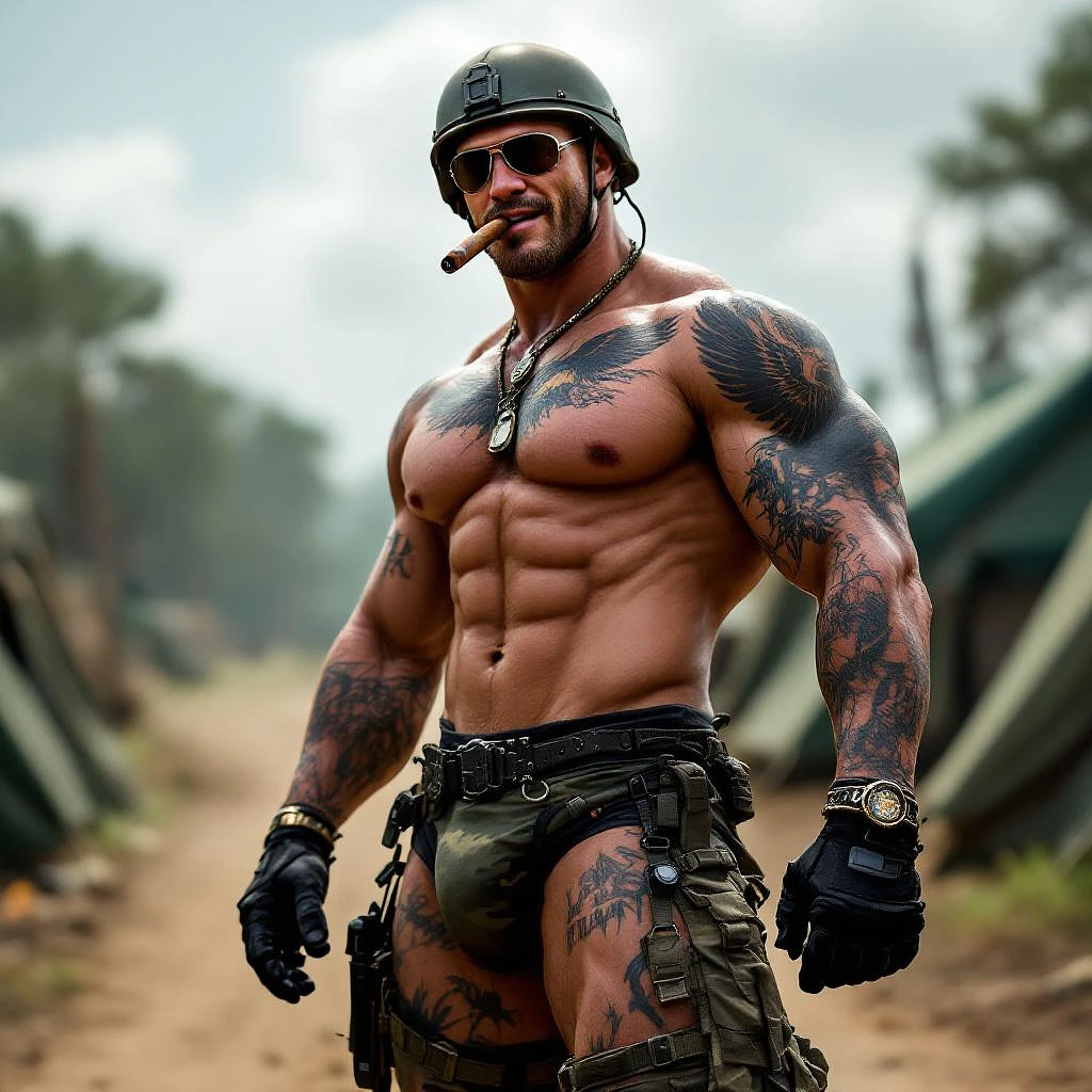 Chris Redfield, Full body image, looking at us, shirtless, muscular abs, lots of tattoos, eagle chest tattoo, dog tags, aviator sunglasses, big cigar in mouth, black fingerless gloves, big long penis bulge in camouflage thong underwear, army helmet, big feet in black combat boots, standing on dirt road with army green tents, flexing one bicep, grinning