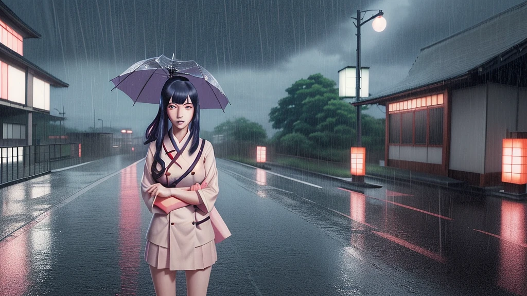 anime style illustration, Ayanokoji Kiyotaka, lone vibes, rainy, school, standing in middle of the road, detailed illustration, highly detailed, high quality, anime illustration, morning, fully colored illustration, good contrast, focus on Ayanokoji Kiyotaka