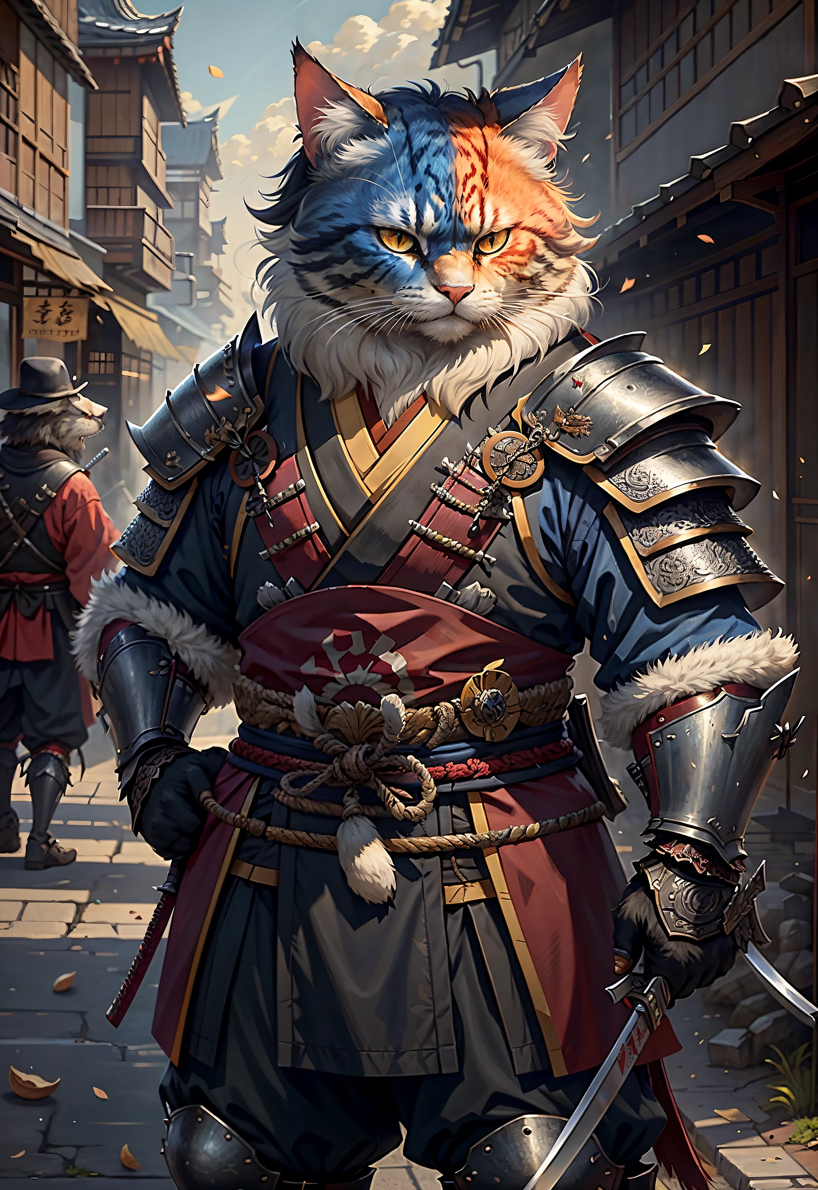 c4ttitude, samurai, watchful, almond-shaped eyes, furrowed brow, sleek fur, warrior, disciplined, focused, armored kimono, guarded coverage, steel, clawed paws, katana, feudal Japan, street, honor, duel, confrontation scene, <lora:c4ttitudeflexver:0.6> , <lora:add_detail:1> , 16k, UHD, HDR, (Masterpiece:1.5) , (best quality:1.5) , 16k, UHD, HDR, (Masterpiece:1.5) , (best quality:1.5)