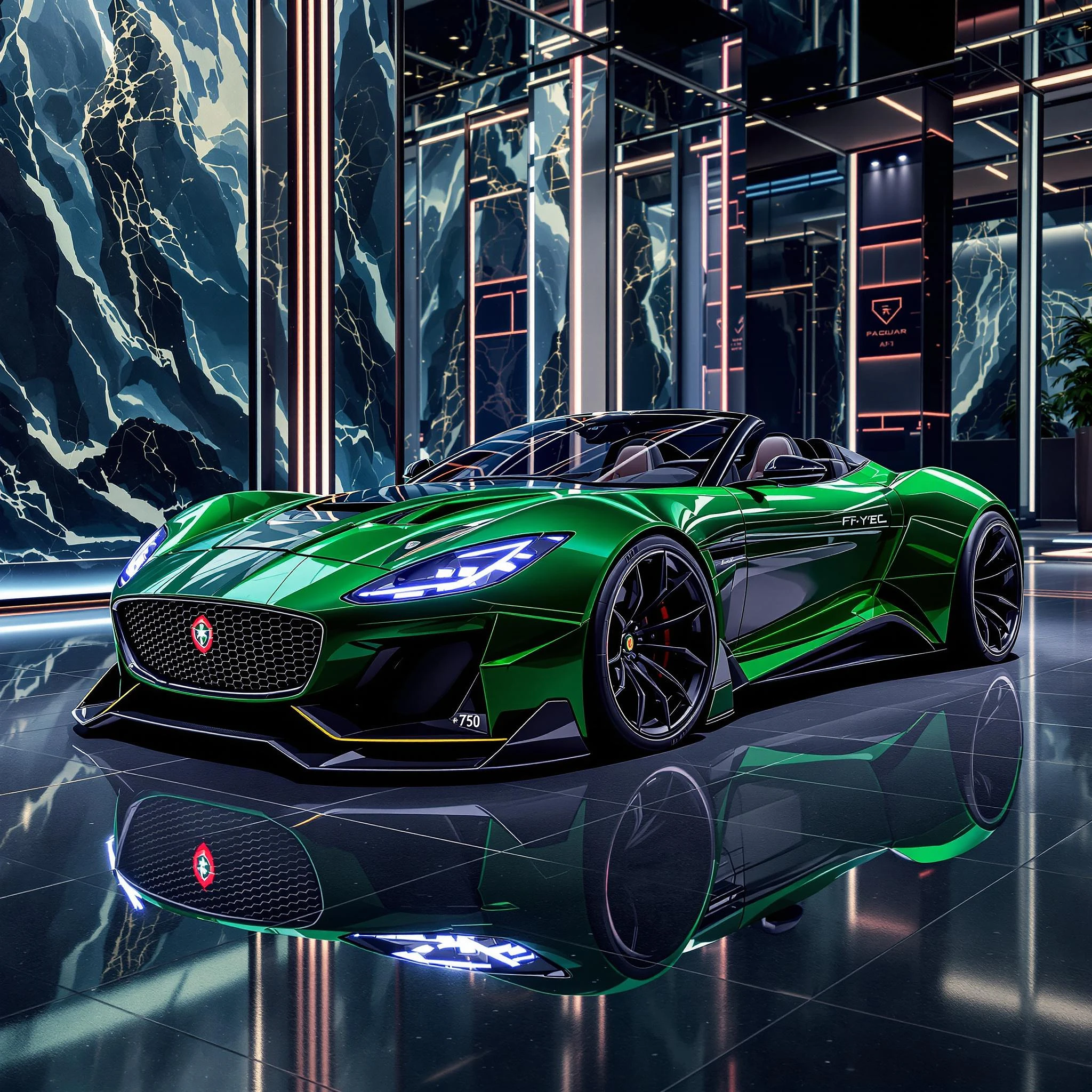 Create a highly detailed and vibrant 16:9 aspect ratio image of a futuristic Jaguar F-Type convertible. The car should have a wide body design, jet engines on each side, and be in British racing green color. It should be depicted as sleek, aerodynamic, and set against a realistic luxurious and glamorous background. The image should be highly detailed and vibrant, incorporating the specified features and colors to create a visually striking and futuristic scene. Please ensure that the image has a stylized effect with a value of 750.