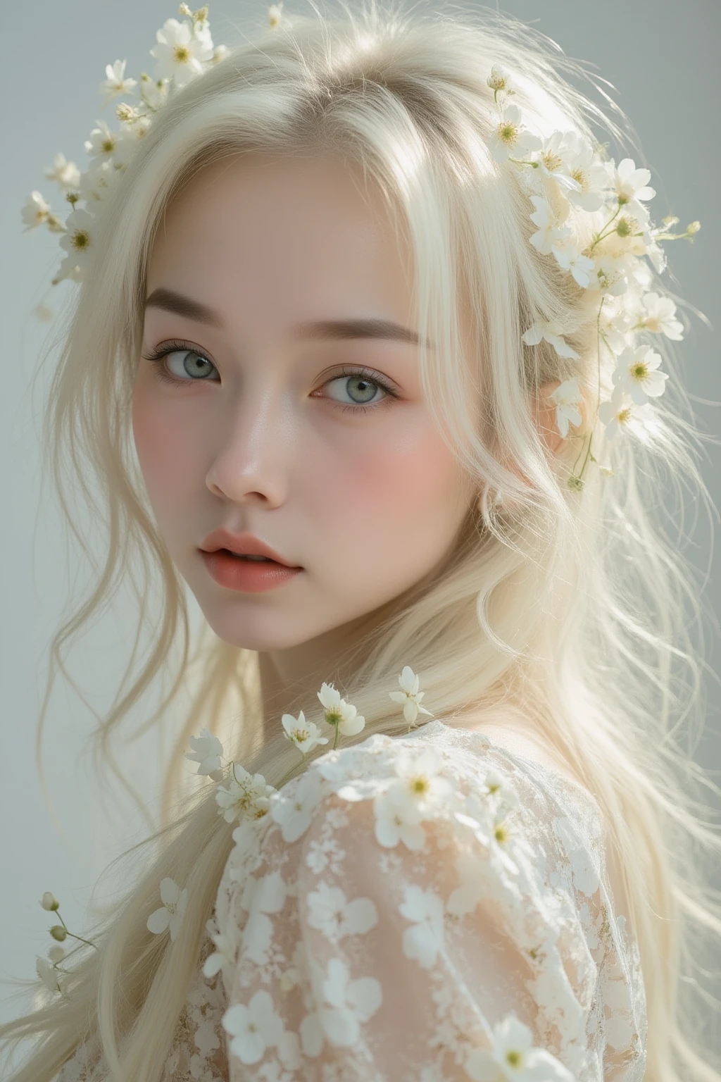 A hyper-realistic studio portrait of a breathtaking woman composed entirely of delicate white flowers. Her translucent, petal-like skin glows softly under ethereal lighting, evoking an almost otherworldly presence. Her hair cascades in long, flowing curls, intricately woven with floral patterns, partially veiling one side of her serene face. The color palette is bathed in dreamy pastel tones, enhancing the surreal beauty and gentle elegance of the scene. Every detail—from the soft textures of the petals to the subtle play of light and shadow—conveys a sense of fragile grace and botanical enchantment.