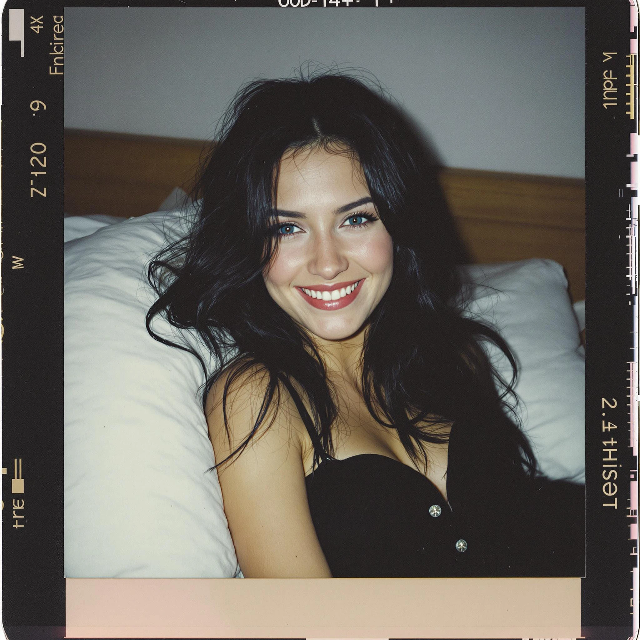 18-year-old woman, black hair, light blue eyes, tanned white skin, thin body, and light makeup. She is in bed, wearing black pajamas, smiling at the polaroid camera